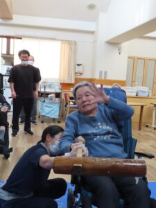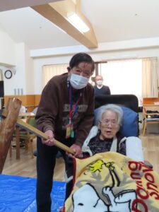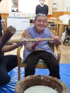 「よいしょ!」の掛け声が響く中、職員と一緒にご利用者様にも餅つきを体験していただきました😄✨