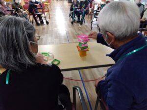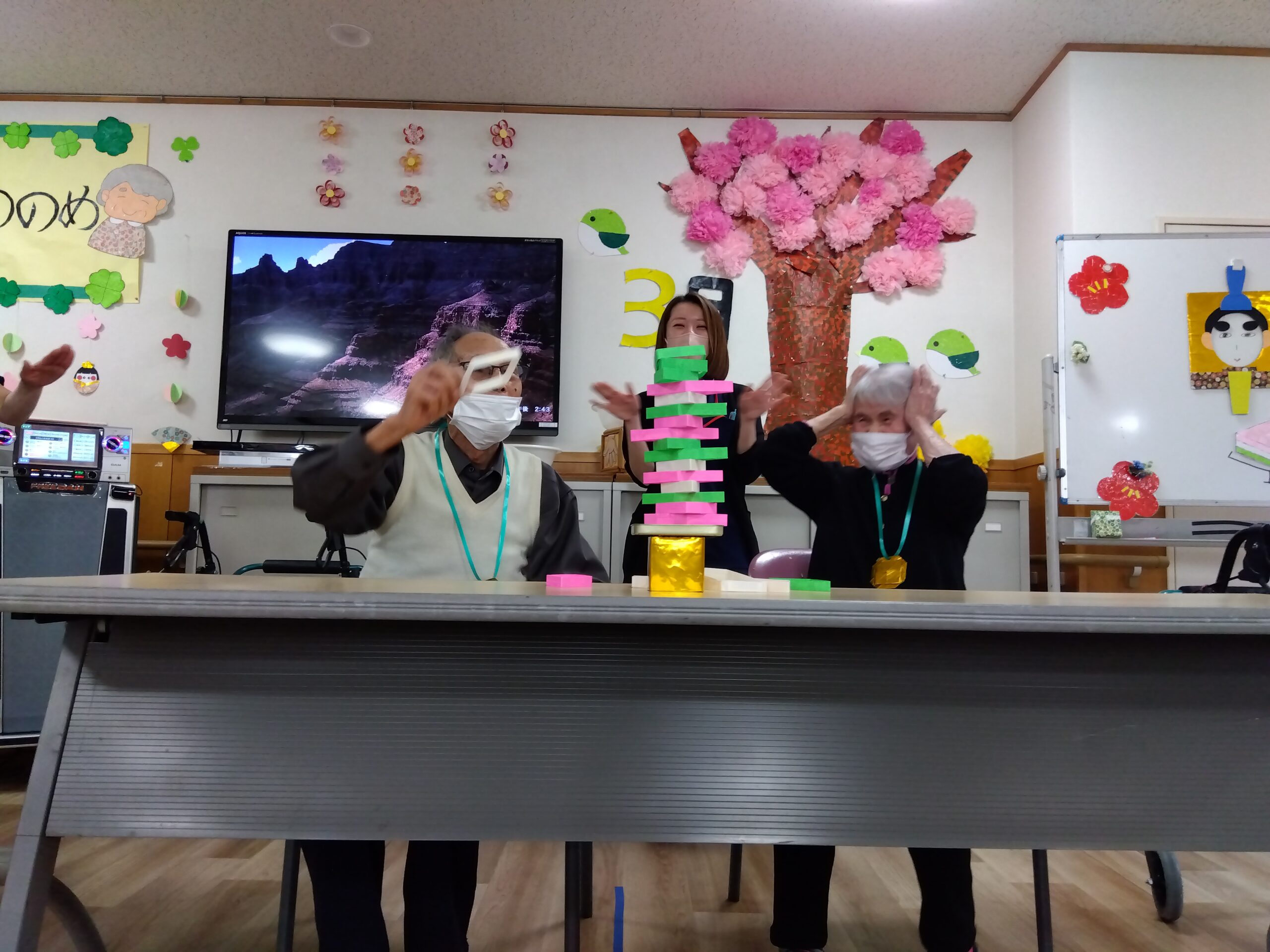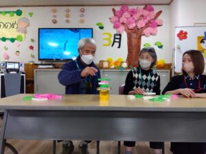 ひな祭りと言えばひし餅!牛乳パックで作ったひし餅を交互に積み上げていき、倒れたら負けというゲームを行いました!!